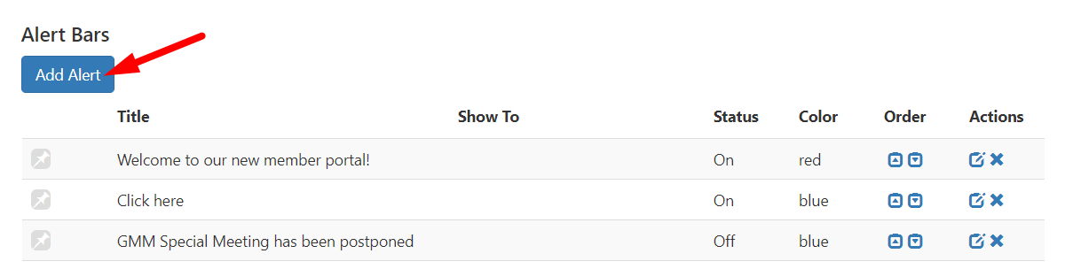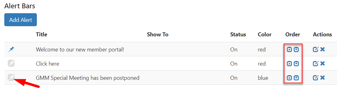 To arrange the order of your alert bar, click on the arrows under Order. To pin an alert to the top of your page or the mobile app, you can click on the pin icon to the left of the alert. You can pin as many alert bars to the top as needed and then resort the order.