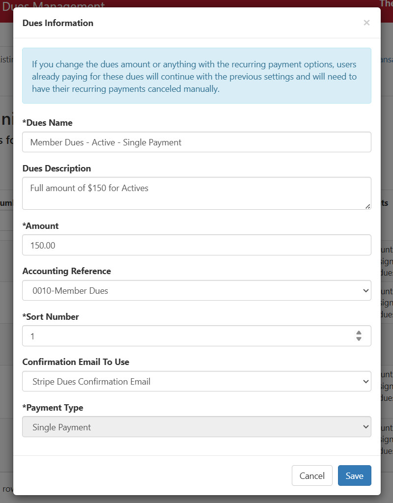 - Dues Name - Enter a descriptive name for your dues definition. e.g. Member Dues - Active - Single Payment