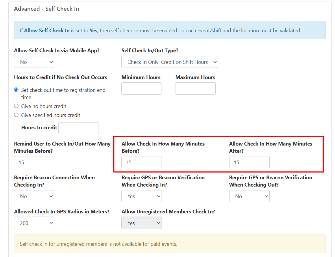 - In addition, Advanced - Self Check In > Allow Check In How Many Minutes Before? and Allow Check In How Many Minutes After? will determine when scanning opens and closes.