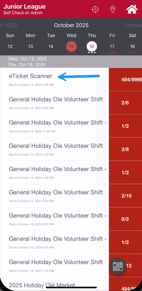 On the day of the event, the Coordinator can use their phone to go in the Junior League app and find the Attendance Manager, where they can scan attendees, see the number of attendees who have checked in and the number of eTickets available