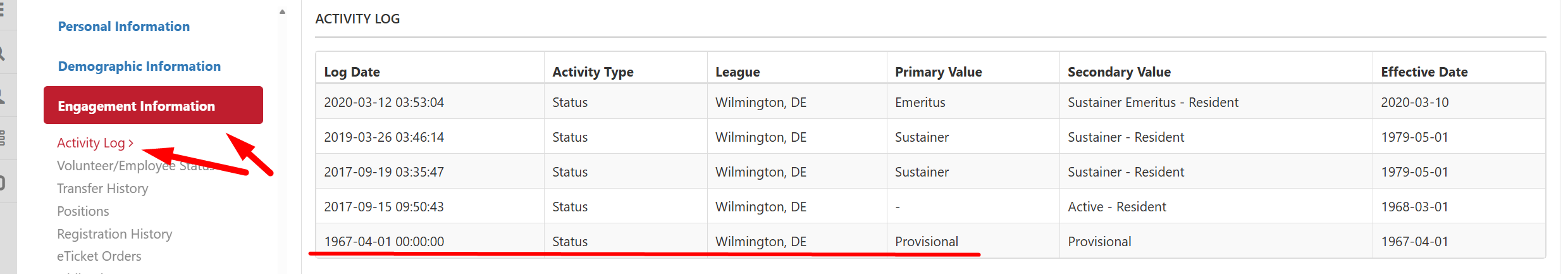 For these Members, their profile's record may have moved between multiple member systems. The member record might have a Provisional date that can be derived from the Activity Log. Here is an example of a Sustainer, where the Activity Log does capture their Provisional year.