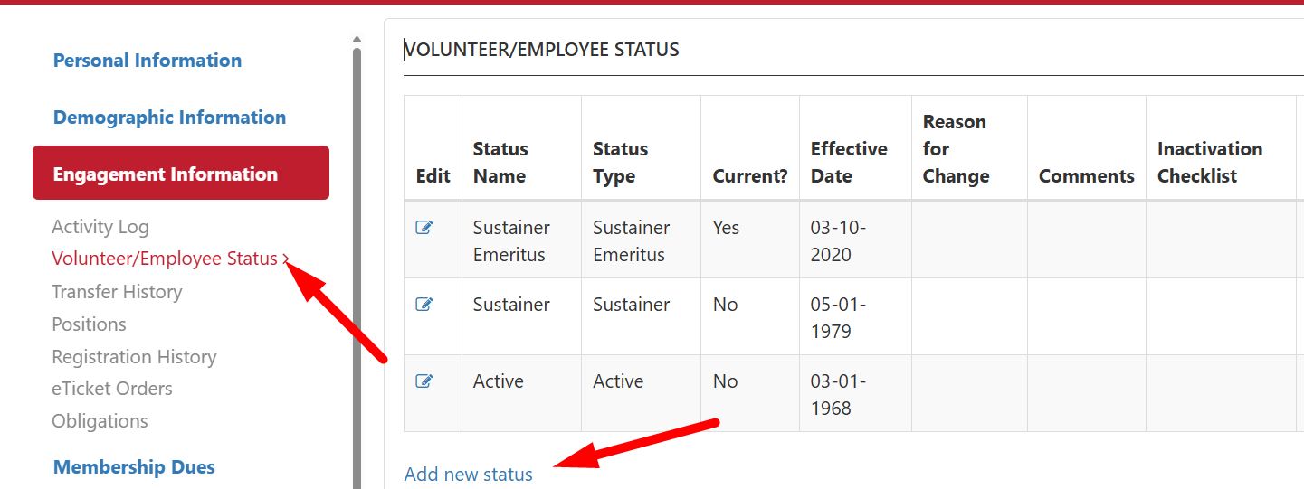 Go to the Admin Profile (or click on the magnifying glass on the left) and find the Member's profile. Then, click on Engagement Information > Volunteer/Employee Status > Add new status.