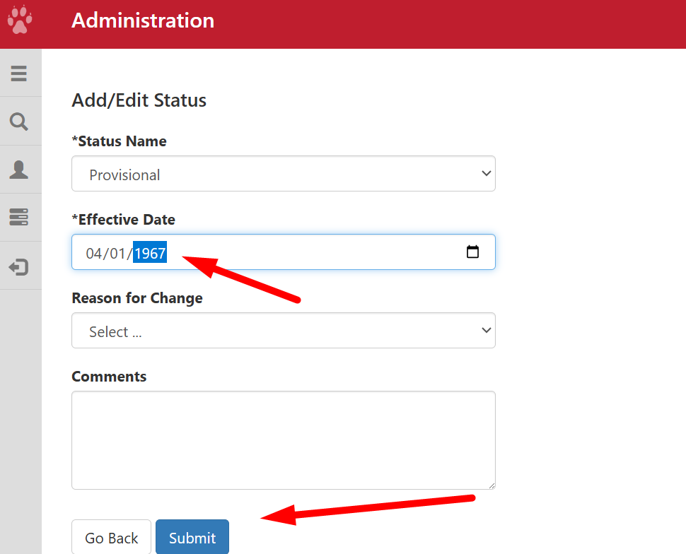 Enter the status and date. Then, click on submit to save your changes. Take note, it will take overnight for the system to update the status change.
